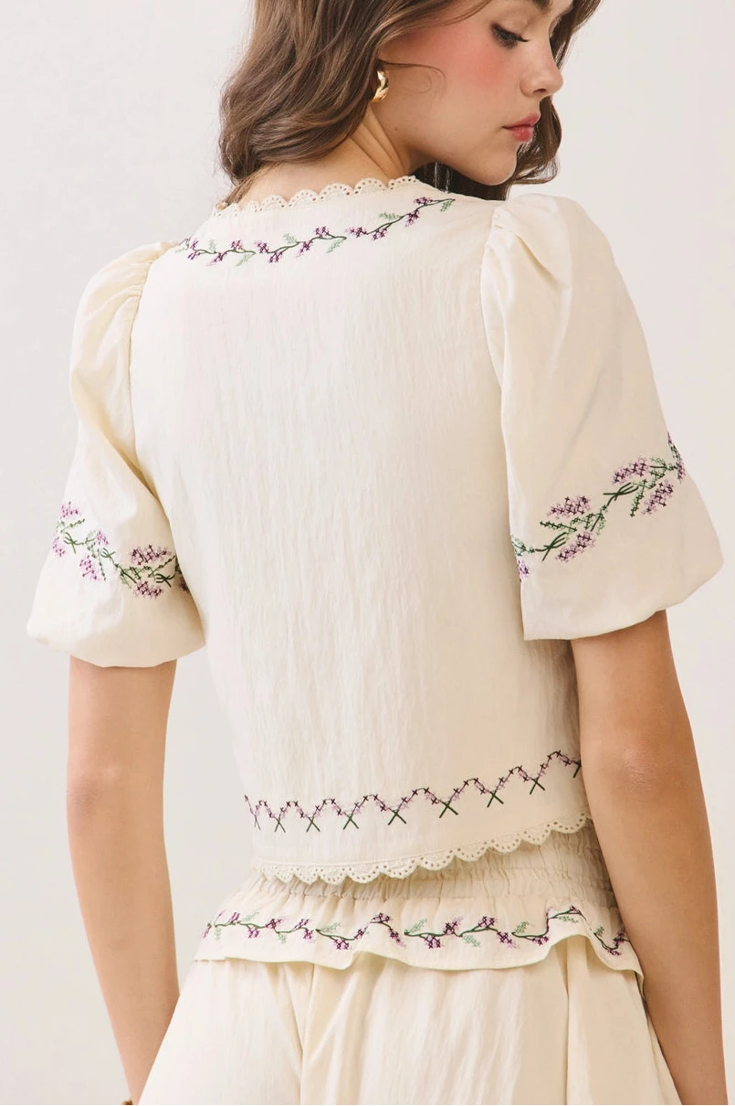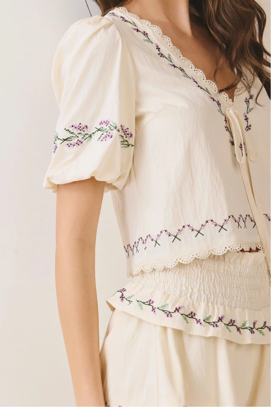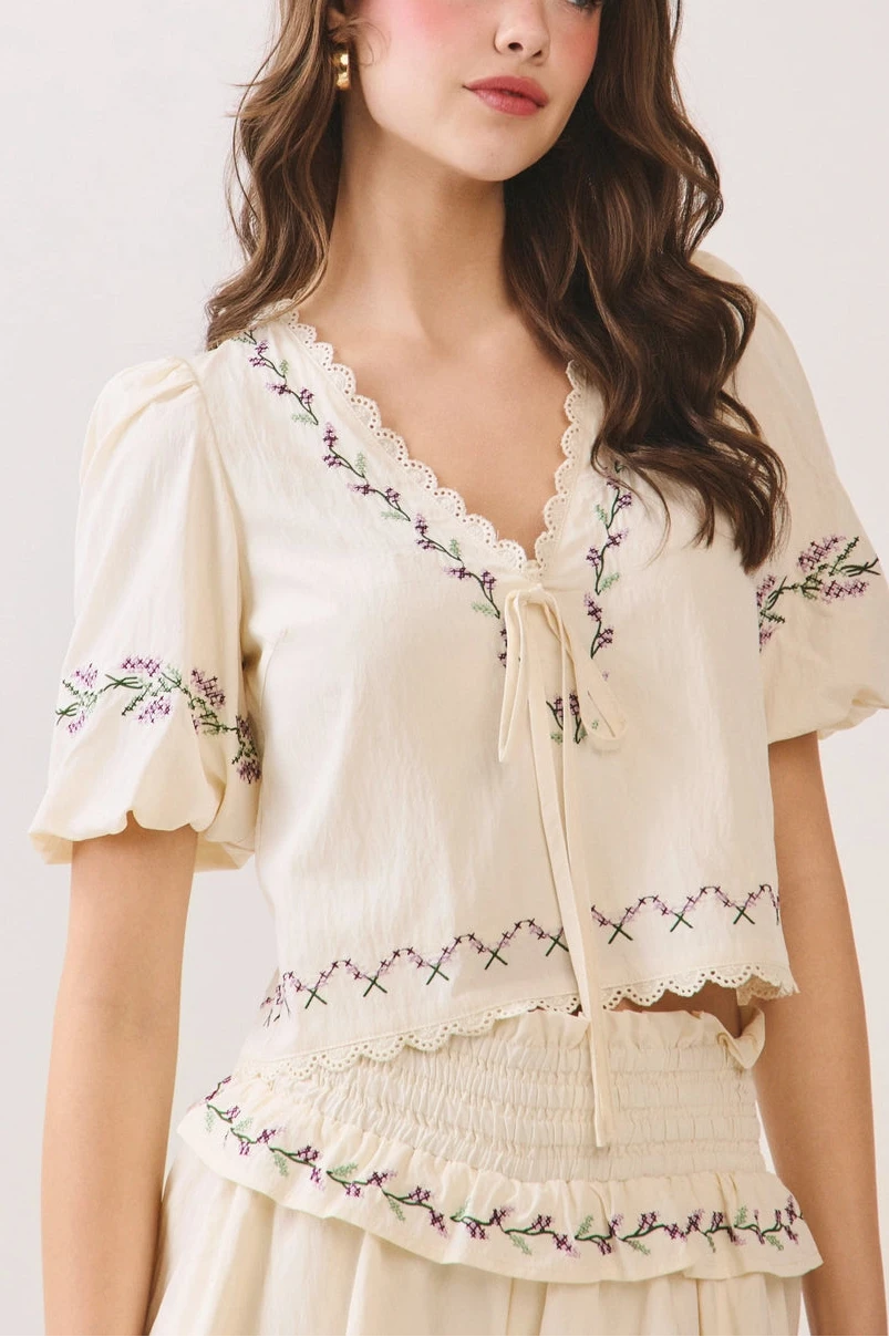 A short-sleeve top featuring a soft V-neckline with delicate lace trim and a front self-tie detail. Designed with subtle puff sleeves and floral embroidery accents. Finished with a slightly cropped silhouette and a scalloped lace hem